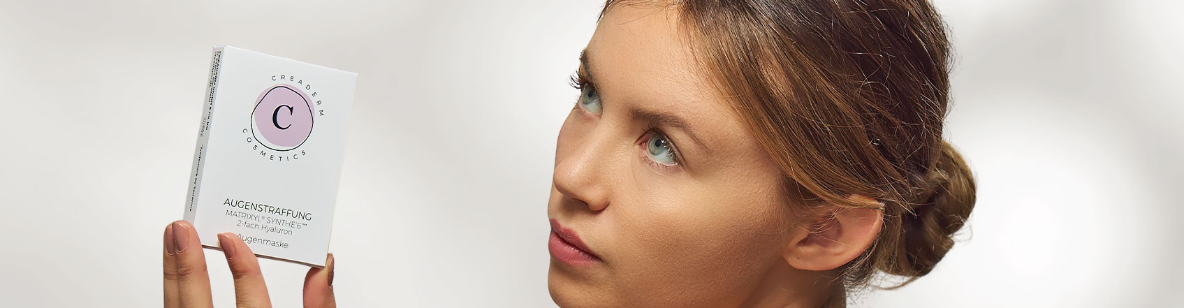 Die Creaderm Augenmaske wurde speziell zur täglichen Pflege der empfindlichen Augenpartie entwickelt. Sie kombiniert den innovativen Anti-Aging-Wirkstoff MA- TRIXYL® SYNTHE’6™ mit zweifacher Hyaluronsäure, einem Vitamin-Komplex ACE, Bio Aloe Vera und Glycerin. Die Maske versorgt die Haut mit intensiver Feuchtigkeit, polstert Fältchen unter dem Auge von innen heraus auf, glättet sichtbar und sorgt für eine sofortige Erfrischung. Dank der reichhaltigen Wirkstoffkombination wird die Hautbarriere gestärkt, die Elastizität verbessert und Anzeichen müder Augen – etwa Schwellungen oder Augenringe – werden weniger sichtbar.
